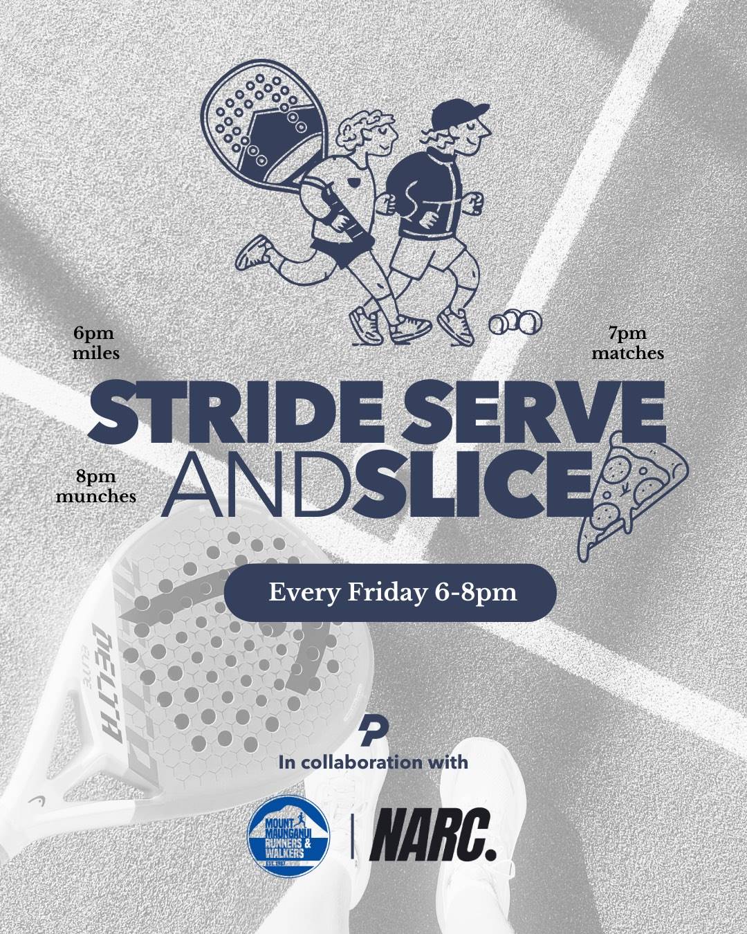 A 30-minute out-and-back run, an hour of social padel, and $5 pizza slices to finish.